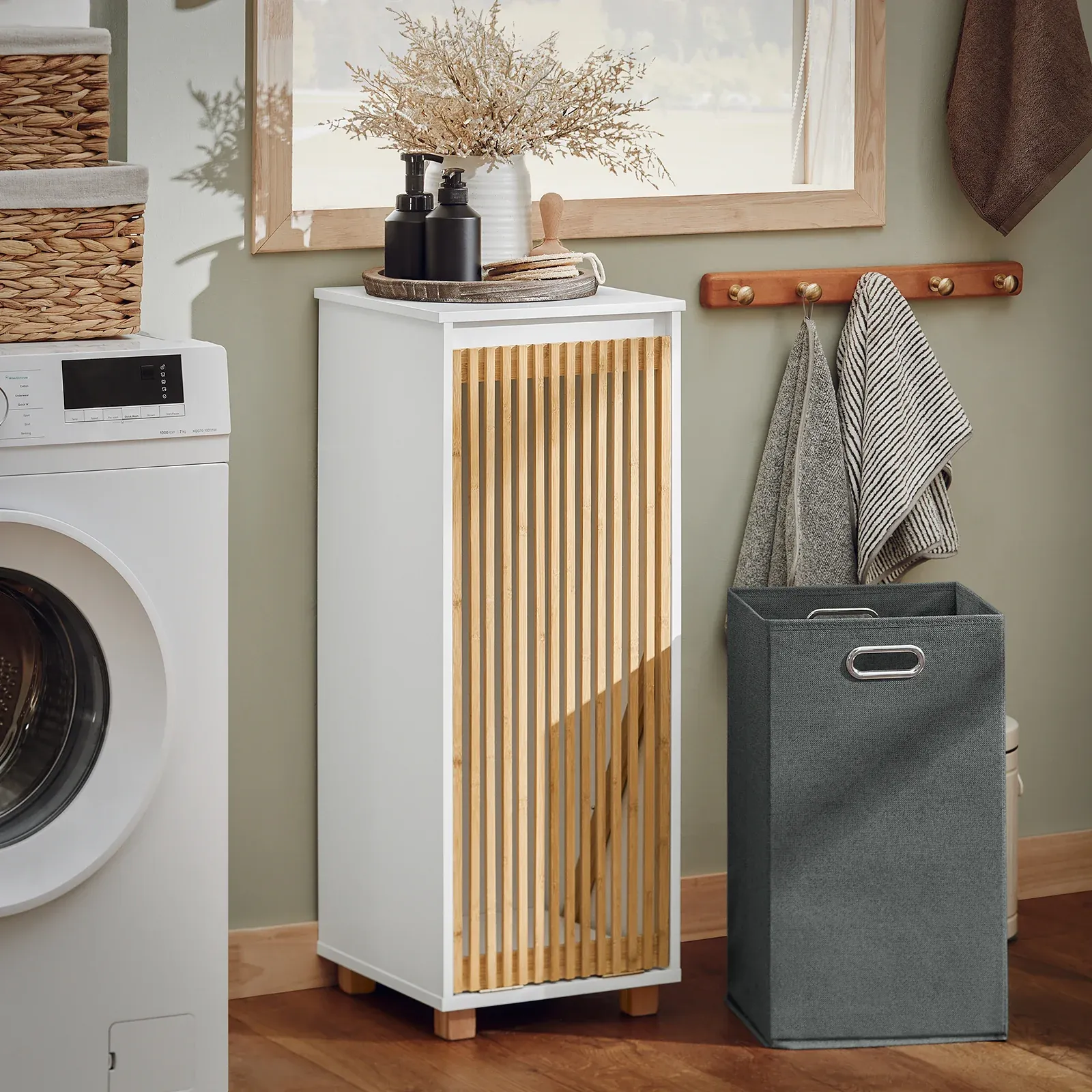 - Medidas de la estructura (L, P, H): 32 x 33 x 85 cm. Medidas del cesto (L, P, H): 28 x 26 x 50 cm. Hay puerta de bambú que le permiten ver el interior sin abrir la puerta. Gracias al diseño de la puerta, no solo agrega un toque extra de elegancia a su interior, sino que también brinda ventilación a este armario.
