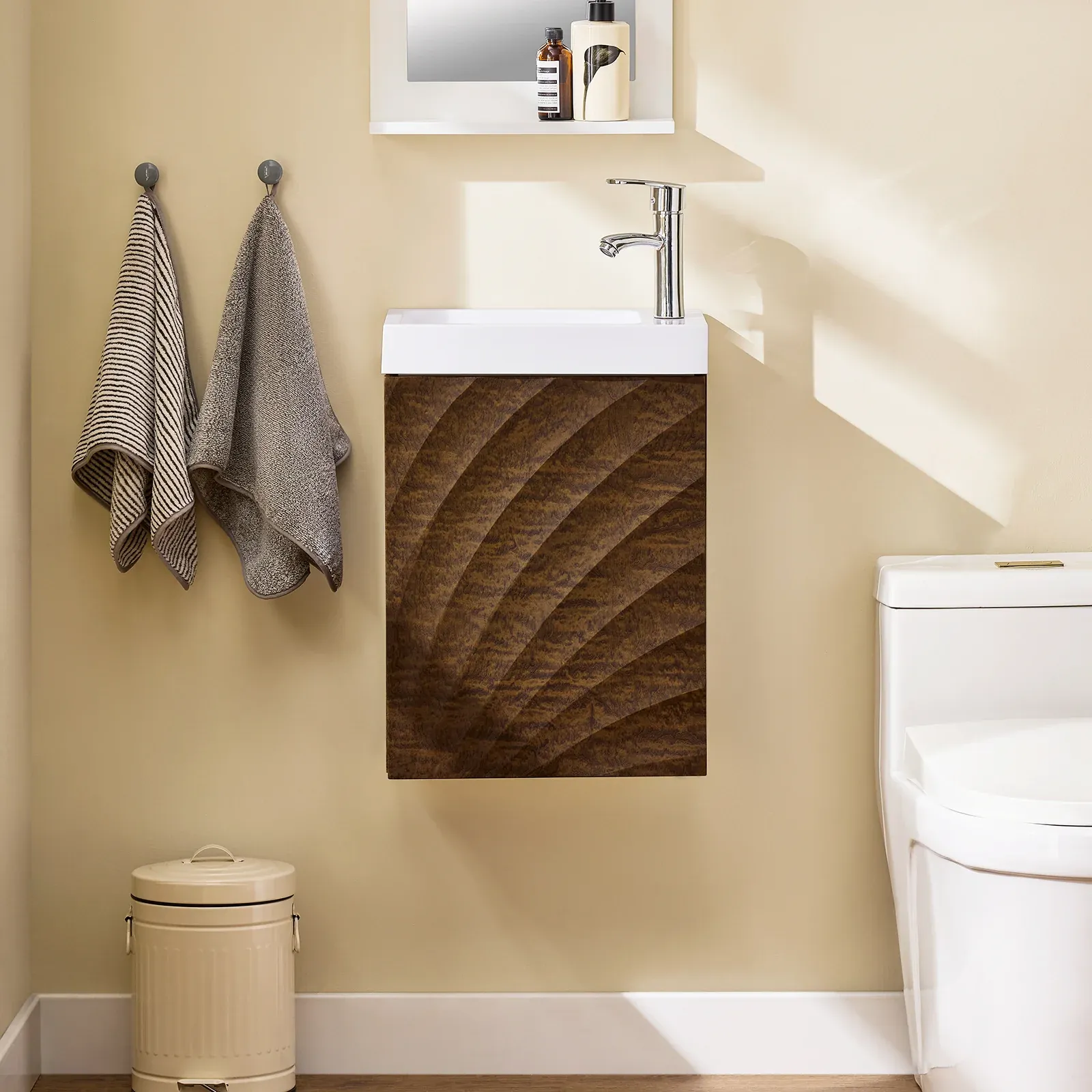 - El lavabo blanco forma un contraste sorprendente con el mueble de madera oscura. El panel de la puerta adopta un diseño ondulado para realzar la sensación de diseño. Este mueble lavabo de pared es la solución ideal para optimizar tu espacio aportando un toque moderno a tu baño.